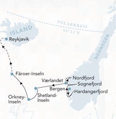 Rejoignez-nous pour un voyage sur les traces des Vikings de la Norvège à l'Islande! Découvrez les spectaculaires fjords norvégiens, comme le Hardangerfjord, le Sognefjord et le Nordfjord et les villages pittoresques avant de traverser la mer du Nord et les îles Orcades. Notre voyage nous emmène ensuite vers les îles Féroé avant de prendre fin dans la capitale de l'Islande, Reykjavik.